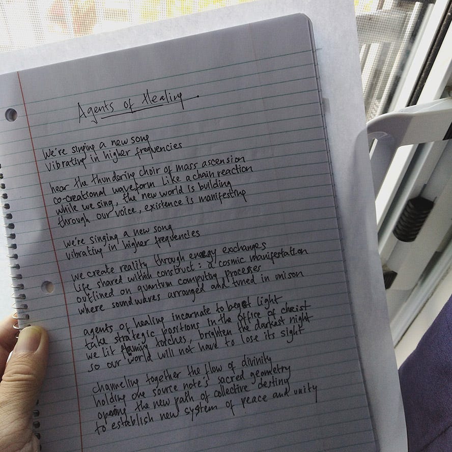 This time, I’d like to share another new lyrics called “Agents of Healing”, and to dive deeper regarding the use of our creative energy to build our reality; what it is, and how it can be interpreted to explain the state of our world. Here’s the photo of the written lyrics and please scroll down below to read the exposition.